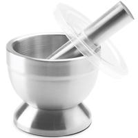 This rugged mortar & pestle set is perfect for cracking and pulverizing harder items into easily manageable pieces. The smooth interior is specially designed to process peppercorns, hard seeds, spices, nuts, grains, and more. The translucent cover shows items clearly and prevents them from escaping during use, while the scratch-free, anti-skid base keeps the mortar in place and protects surfaces. Made from 18/8 stainless steel, the set is hand washable in warm, soapy water. The mortar is 3.5" in diameter and 4" tall, the pestle is 5" long.