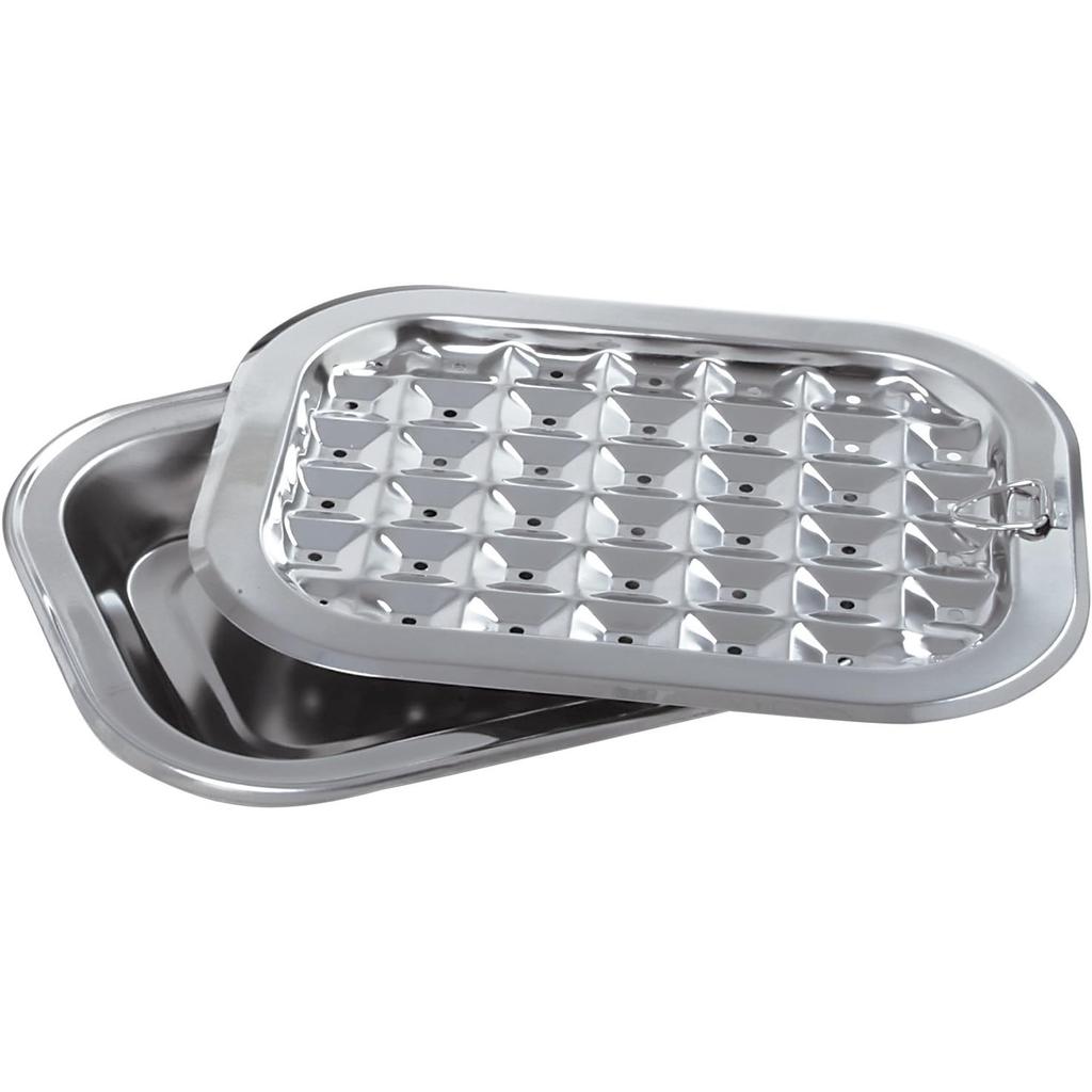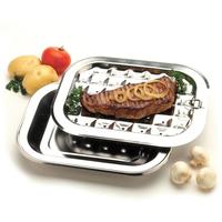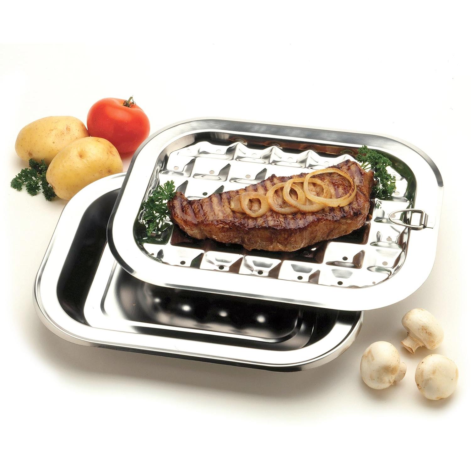 Perfect for broiling meat, chicken or fish, this handy pan features a perforated top piece that allows fats and juices to drip through to the bottom part for leaner cooking. It measures 12" x 9" and is dishwasher safe.