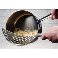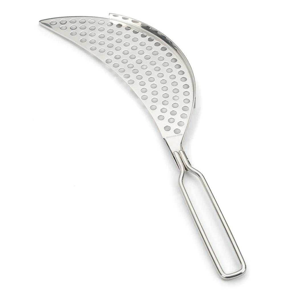 Better than the pan lid for holding back food while the cooking liquid drains out, this strainer features a crescent design that will fit in most pots and pans, with a non-directional handle allows for left-and-right-handed users. Made of durable, dishwasher-safe 18-8 stainless steel, the strainer portion measures 9.5" with 6" handle.
