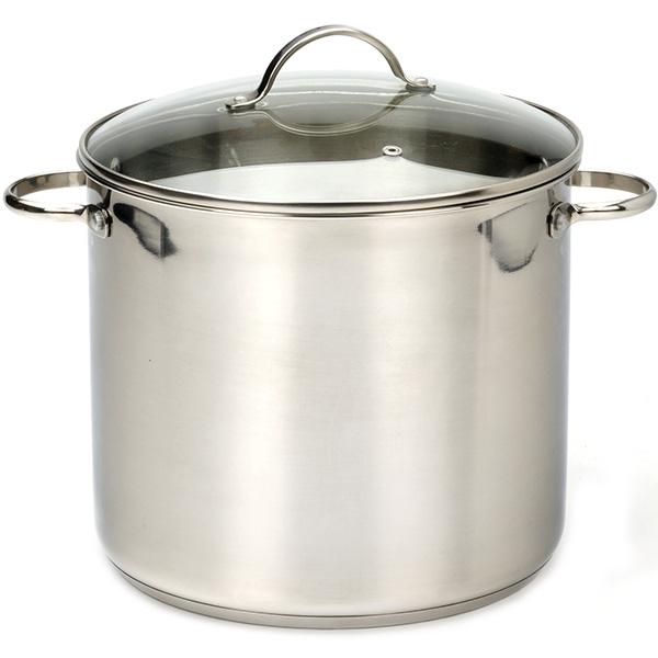 Need a really nice, great-big stockpot at a more-than-reasonable price? Well, here it. This 12-qt. stockpot is made of 18/8 stainless steel, with a bottom that sandwiches a thick layer of aluminum for rapid heat conduction. This construction ensures that the pot heats quickly and that it works on all types of stovetops, including magentic induction. The two loop handles are riveteed to the body of the pan, and the glass lid (no need to keep lifting to check a simmer) is tempered, so it's oven-safe to 450 degrees F. The lid also features a steam vent to minimize rattling. Of course, this stockpot and its lid are dishwasher safe.