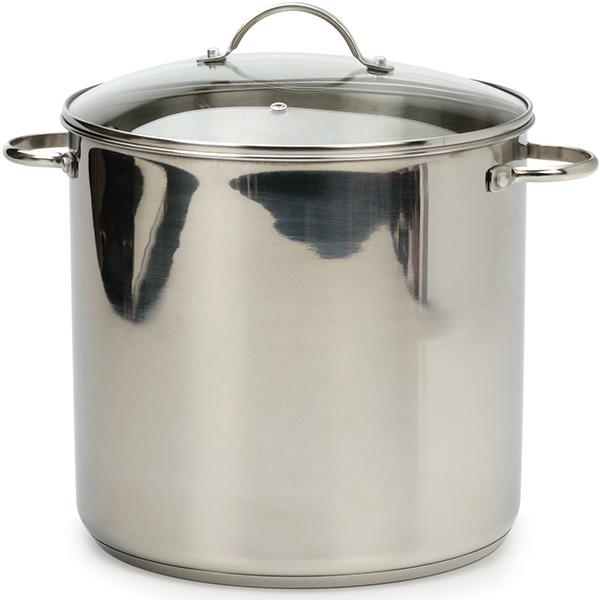 Need a really nice, really big stockpot at a more-than-reasonable price? Well, here it. This 16-qt. stockpot is made of 18/8 stainless steel, with a bottom that sandwiches a thick layer of aluminum for rapid heat conduction. This construction ensures that the pot heats quickly and that it works on all types of stovetops, including magentic induction. The two loop handles are riveteed to the body of the pan, and the glass lid (no need to keep lifting to check a simmer) is tempered, so it's oven-safe to 450 degrees F. The lid also features a steam vent to minimize rattling. Of course, this stockpot and its lid are dishwasher safe.