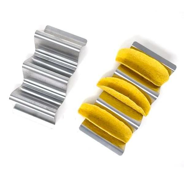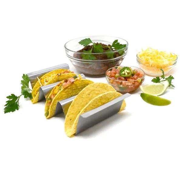 These stainless steel racks allow you to warm your tortillas or taco shells in the oven or on the grill. And, you can easily build your tacos right in the racks with a stable foundation for your taco creations. Plus, using the racks eliminates shell breakage and reduces preparation and clean up time. Each rack holds up to 3 shells or tortillas and measures 8" x 4".
