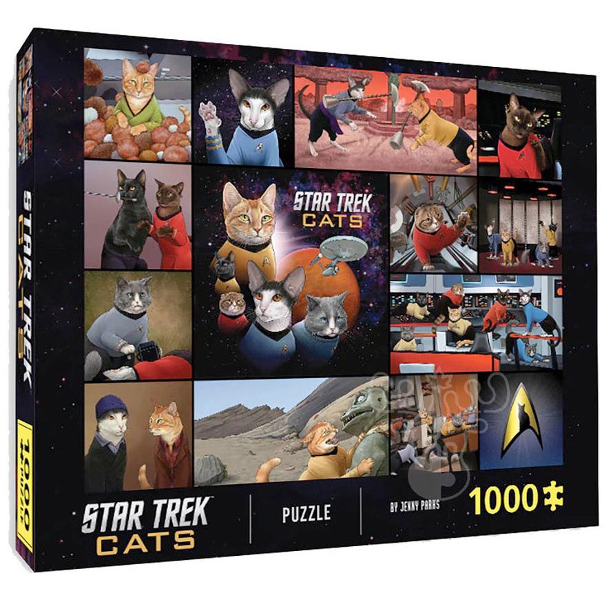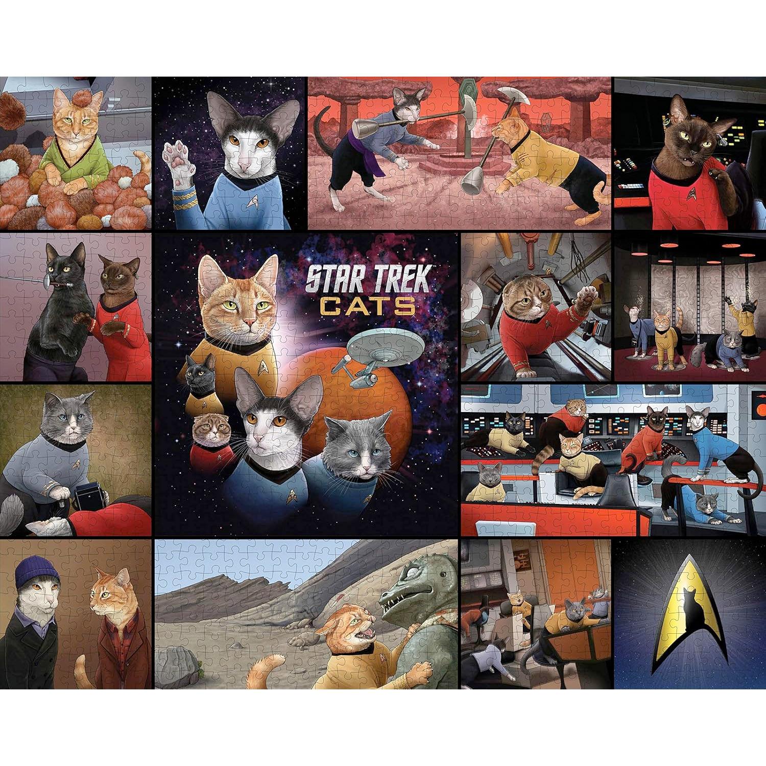 This puzzle reimagines the 55-year legacy of Star Trek: The Original Series with a feline twist. From the crew aboard the deck of the U.S.S. Enterprise to the legendary meeting with Tribbles and beyond, rediscover your favorite moments with Captain Kirk, Mr. Spock, Dr. Leonard McCoy, Nyota Uhuru, Hikaru Sulu, and more in this colorful and hilarious new puzzle. The completed puzzle measures 25” x 20”.