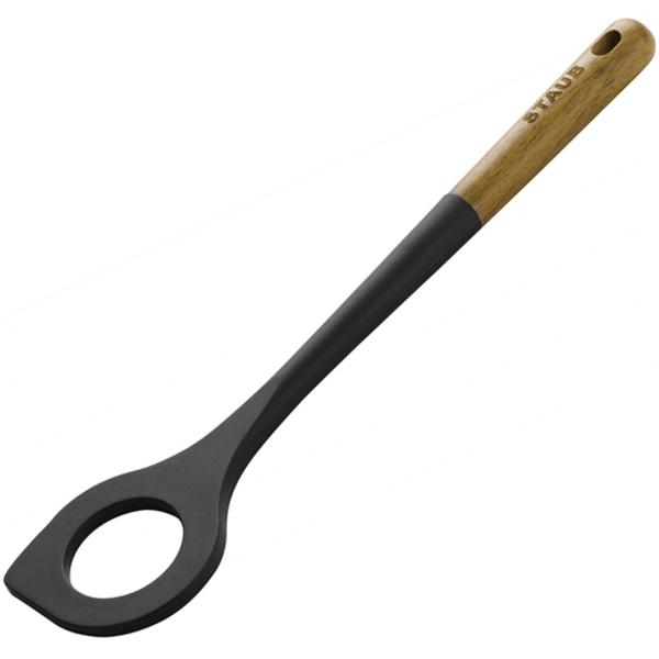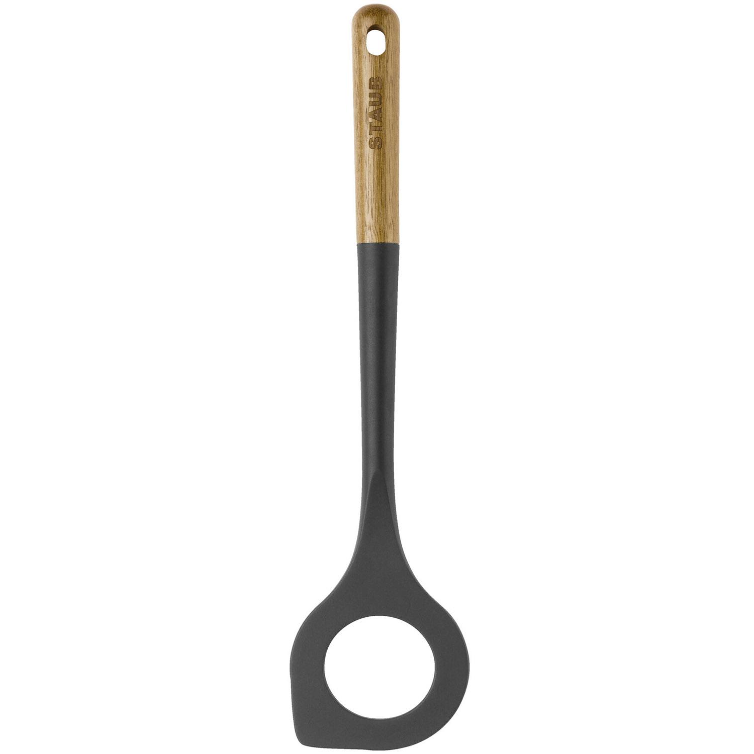 Staub utensils, as you should expect, are superbly designed and made. They feature eco-friendly, stay-cool acacia wood handles and heads made of matte-black silicone. The flexible silicone is impervious to stains and safe to use in hot pans, and is perfect for use in non-stick cookware. The heads are designed to fit in most any pot, pan or bowl. Hand wash, due to the wood handle.