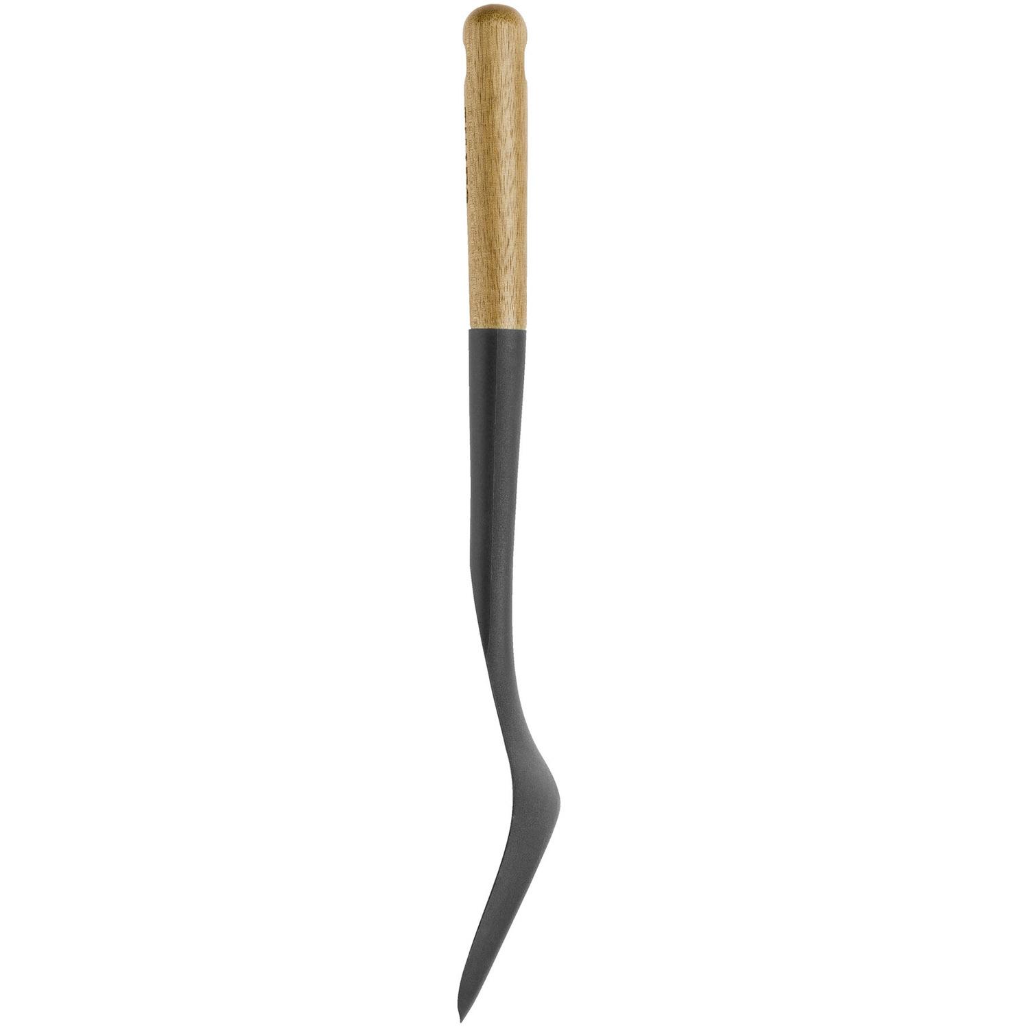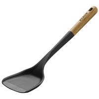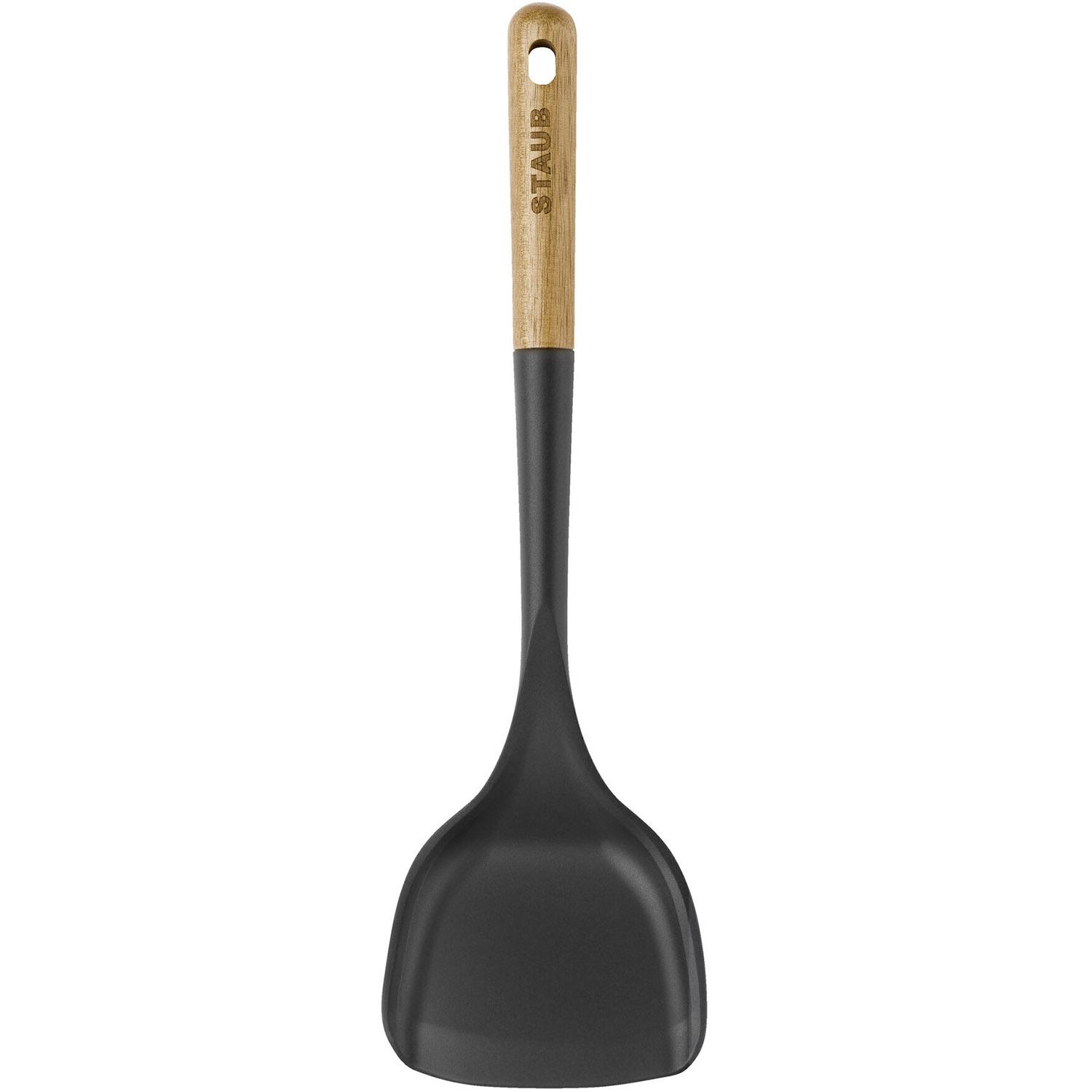 Staub utensils, as you should expect, are superbly designed and made. They feature eco-friendly, stay-cool acacia wood handles and heads made of matte-black silicone. The flexible silicone is impervious to stains and safe to use in hot pans, and is perfect for use in non-stick cookware. The heads are designed to fit in most any pot, pan or bowl. Hand wash, due to the wood handle.