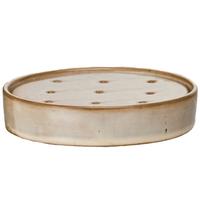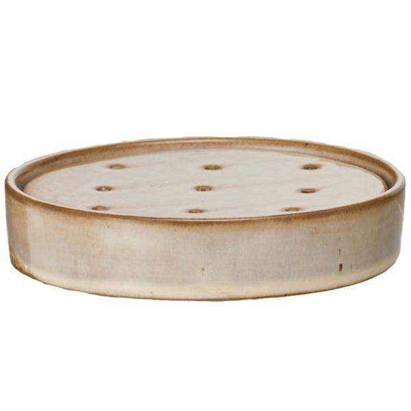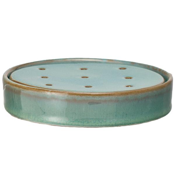 These stoneware soap dishes features a reactive glaze that ensures that each example is unique in appearance. The dishes measure 5" in diameter and feature a removable center section. Choose from two colors, priced and sold individually. Please specify your choices in the Order Notes field in your shopping cart.