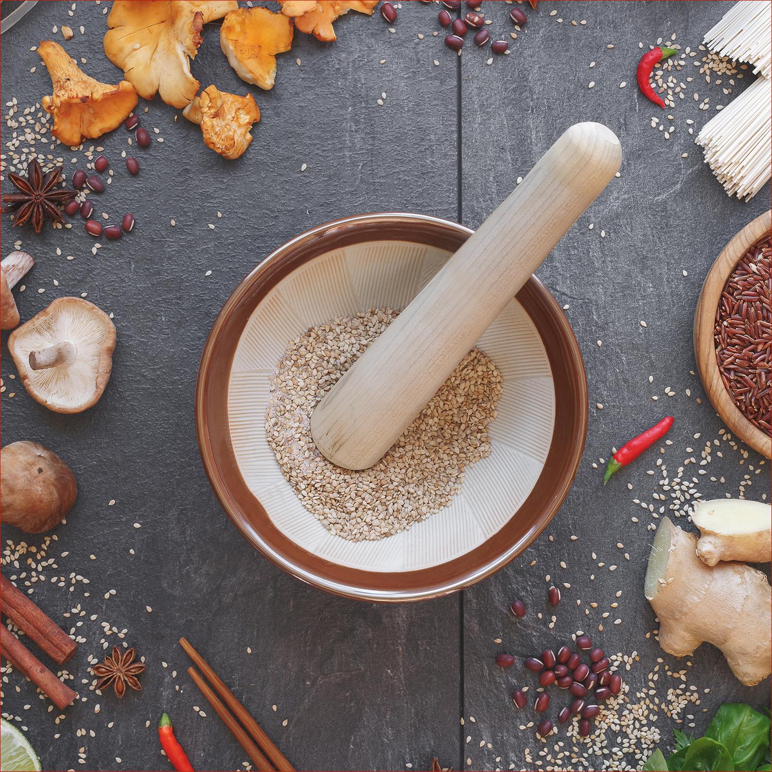 This traditional Japanese grinding bowl and pestle, efficiently grinds items into a fine paste or powder. It's ideal for crushing seeds, garlic, herbs, nuts, and seasonings. The sharply ridged interior holds contents in place for more efficient grinding, while the wooden pestle grinds ingredients without wearing down the mortar ridges. The durable earthenware mortar measures 5.5" in diameter, the wood pestle is 4.75" long. To clean, dislodge any remaining food bits with a soft bristle brush, then rinse in hot water without soap.