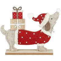 This Santa dachshund comes bearing gifts. Made of felt, it sits on a wood base and measures 10” wide.