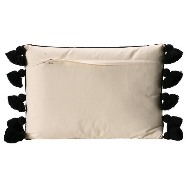 This distinctive pillow features tassles and a bold pattern. The cover is made of 100% cotton and the pillow measures 26" x 18".