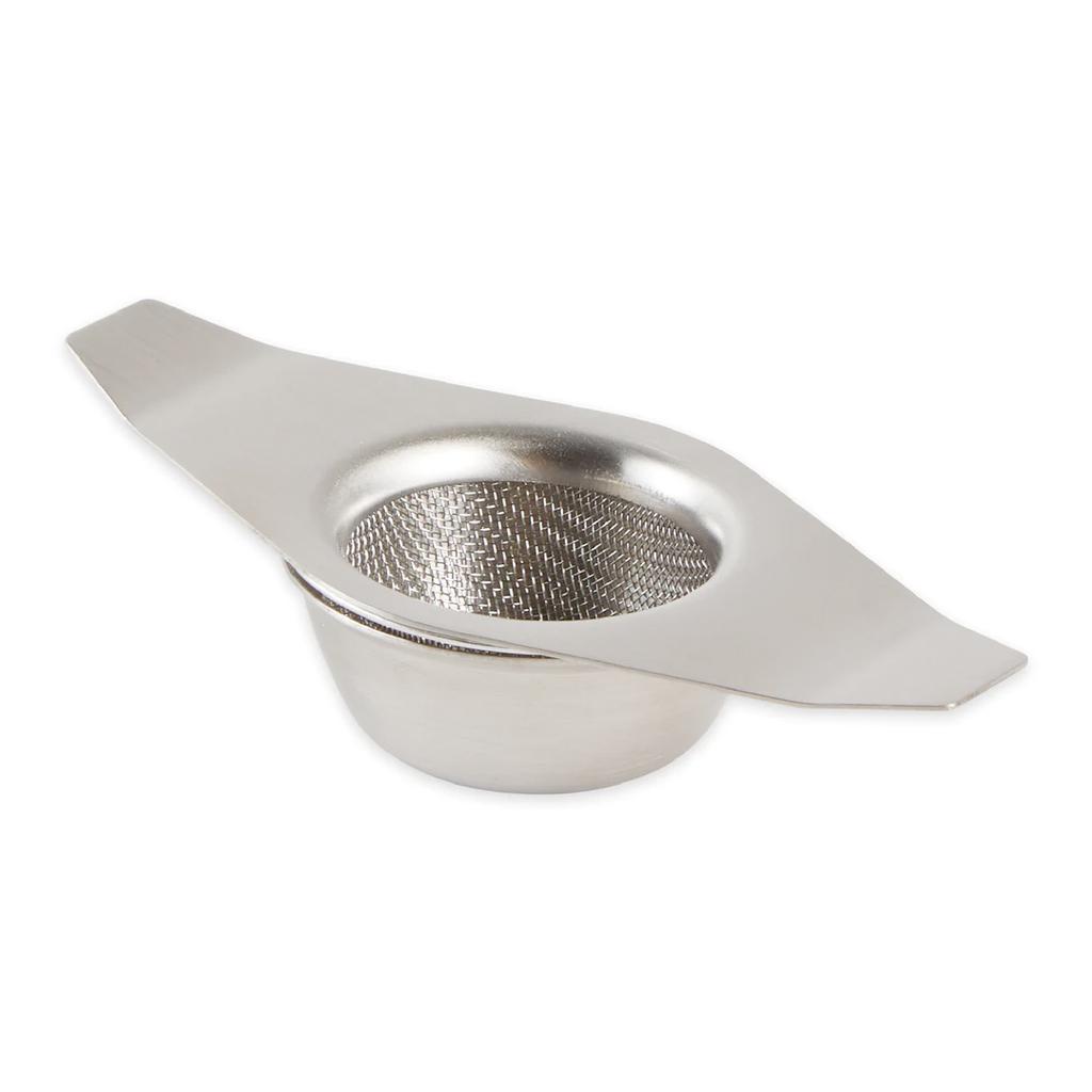 This stainless-steel strainer for loose-leaf teas features wide, angled support arms to fit on a wide variety of cups and mugs. The stainless cup holds the strainer and catches the drips.