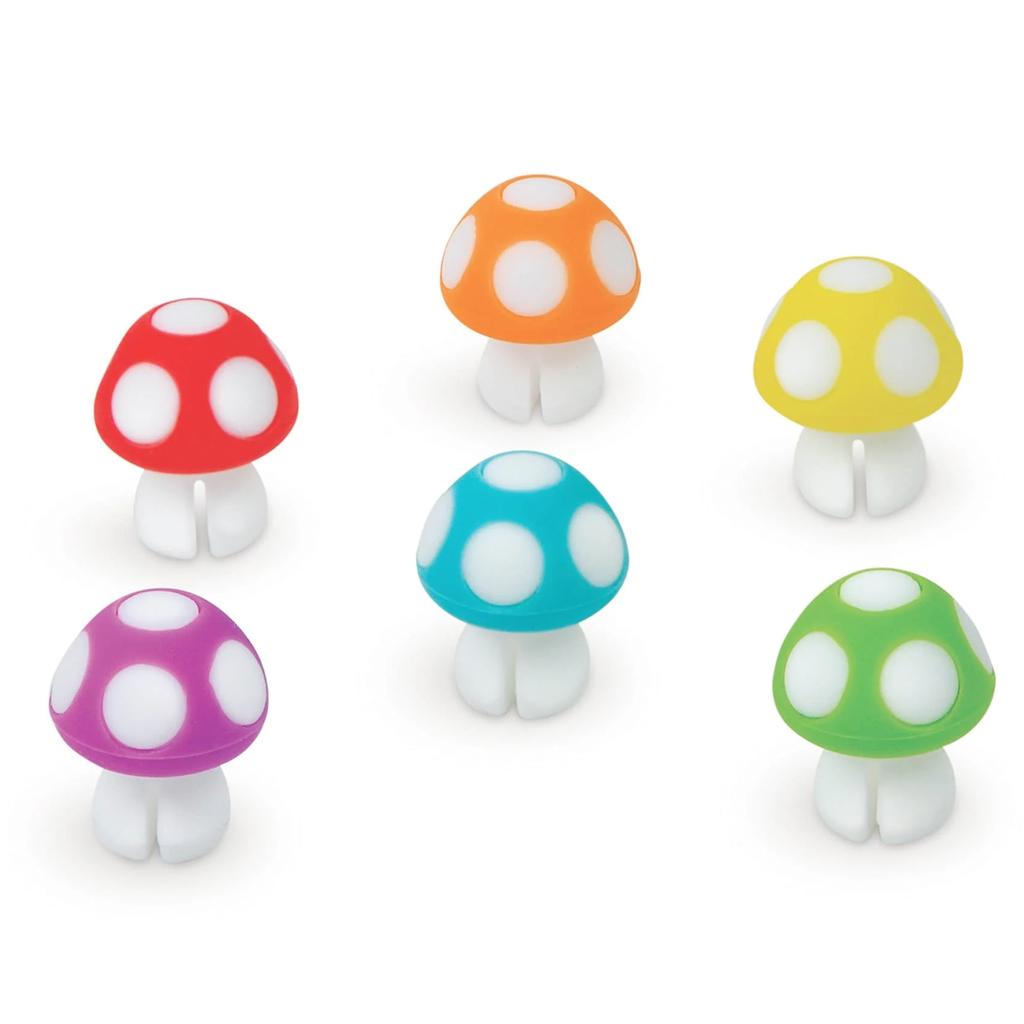 Little mushrooms that hang on the edge of a glass and clearly differentiate each beverage. Made of food-safe silicone, each toadstool is just under 1" tall.