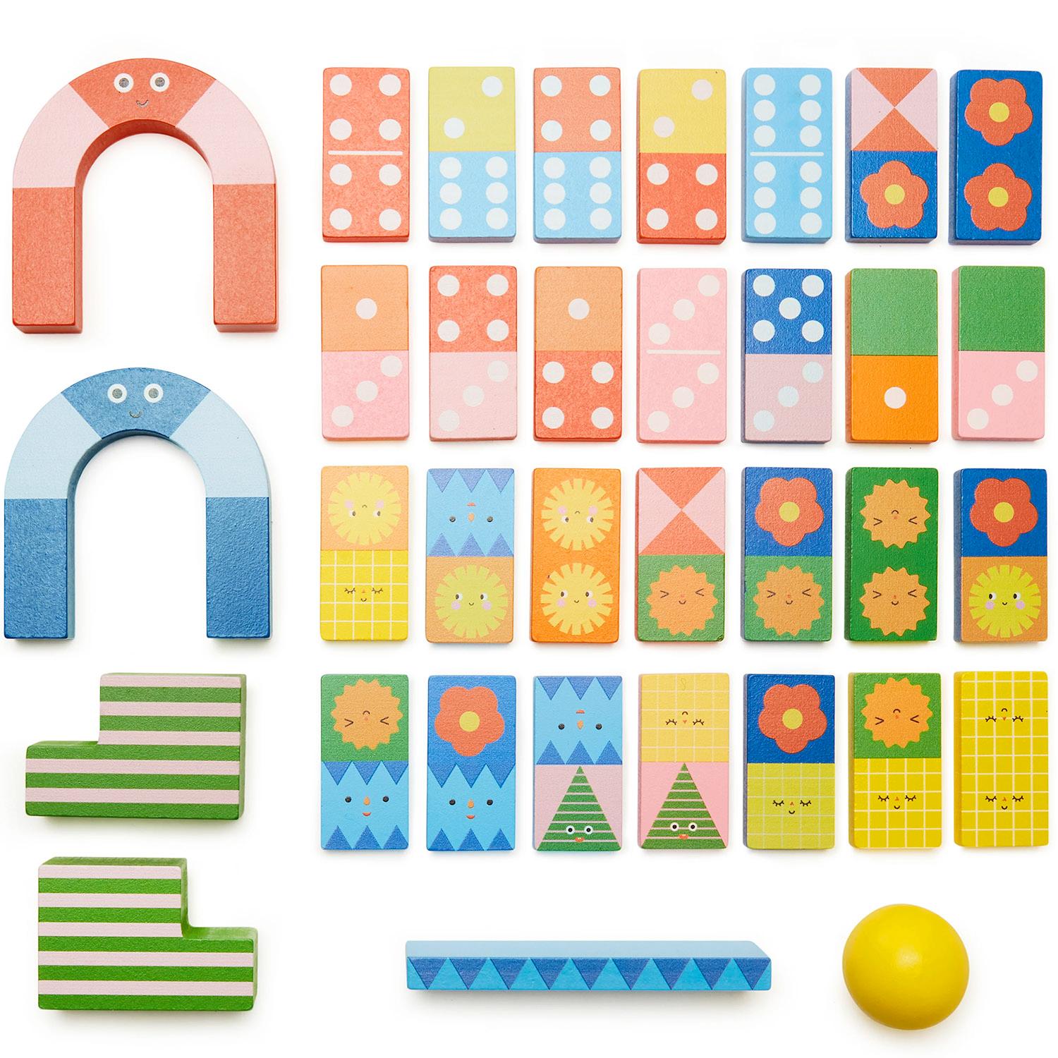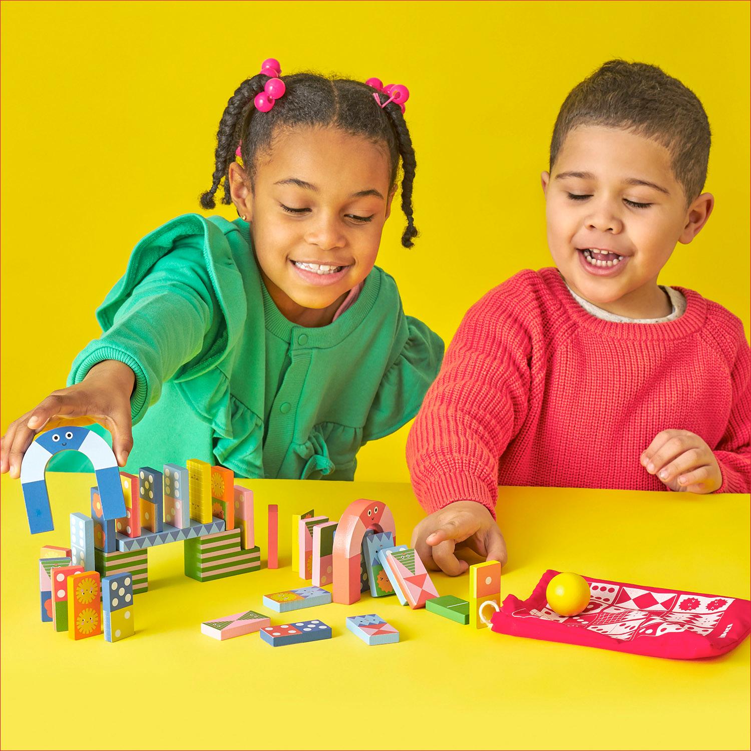Fun, fun, fun! These Kidoki dominoes are not just for playing the traditional game - they can be used to create a variety of courses that involve knocking down the dominoes with balls, passing under arches, and navigating stairs. Made of MDF, these dominoes come with a convenient cotton storage bag.