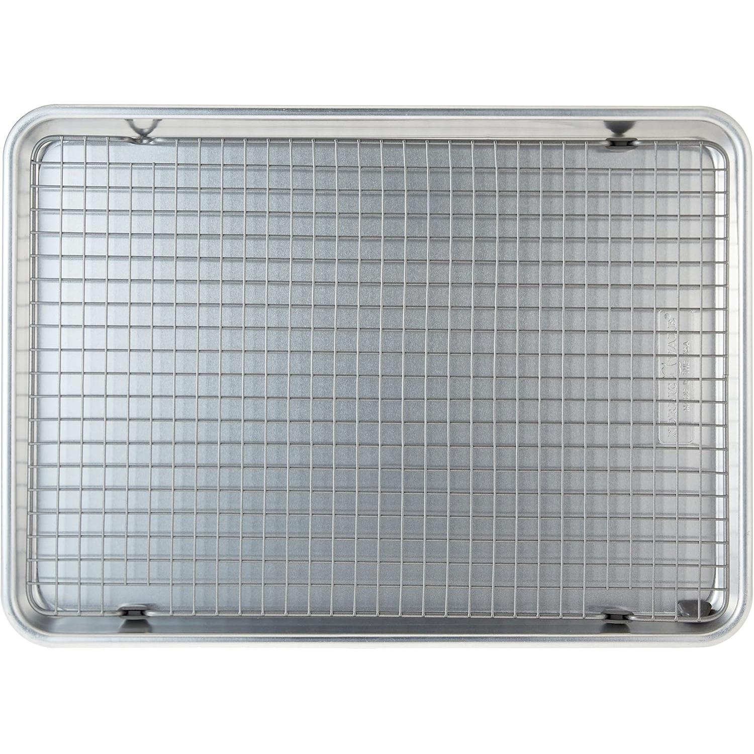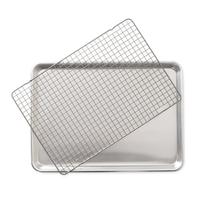 This set from Nordic Ware is certainly versatile: it's a cookie sheet and a cooling rack, a roasting pan with an elevated oven rack, and a good old sheet pan. The 16.3" x 11.3" (interior dimensions) pan is a full 1" deep and made of aluminum for rapid and uniform heat conduction. The rack is made of steel and features a non-stick surface for easy clean up. We recommend hand washing to preserve the finishes. Made in the U.S.