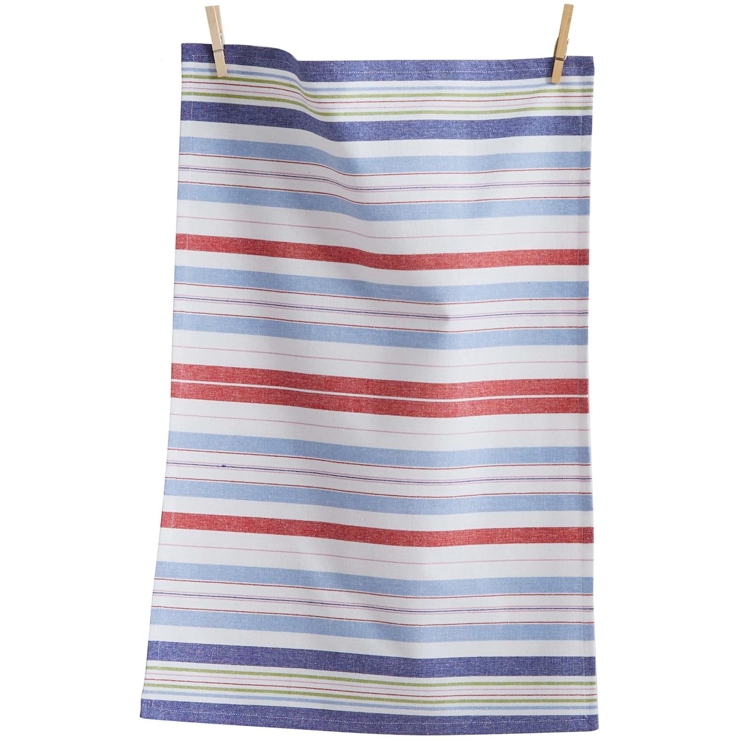 Two 100% cotton towels, one hand-screen-printed on a satin weave, the other featuring yarn-dyed woven stripes, and both measuring 18” x 26”. Machine wash cold, tumble dry low.
