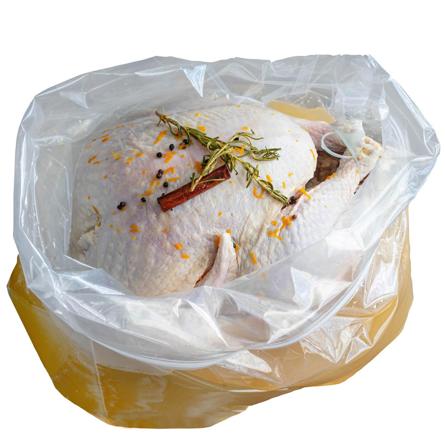 This large-capacity bag features a leak-proof zipper closure and large handles to help transport the turkey. It lets you brine easily without a struggle or mess. It's made of extra-thick (80-micron) food-safe plastic, measures 24" x 24" (including handle), and holds up to a 20-pound turkey. It's reusable; hand wash between uses and dry thoroughly before storing.