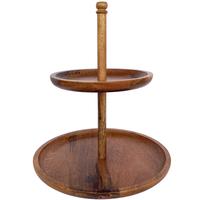 A charming piece for the table or sideboard, for storage or display, this two-tier tray is made of solid mango wood and features a beautiful color and grain pattern. The large tray measures 13" in diameter and the center pole measures 16" tall.