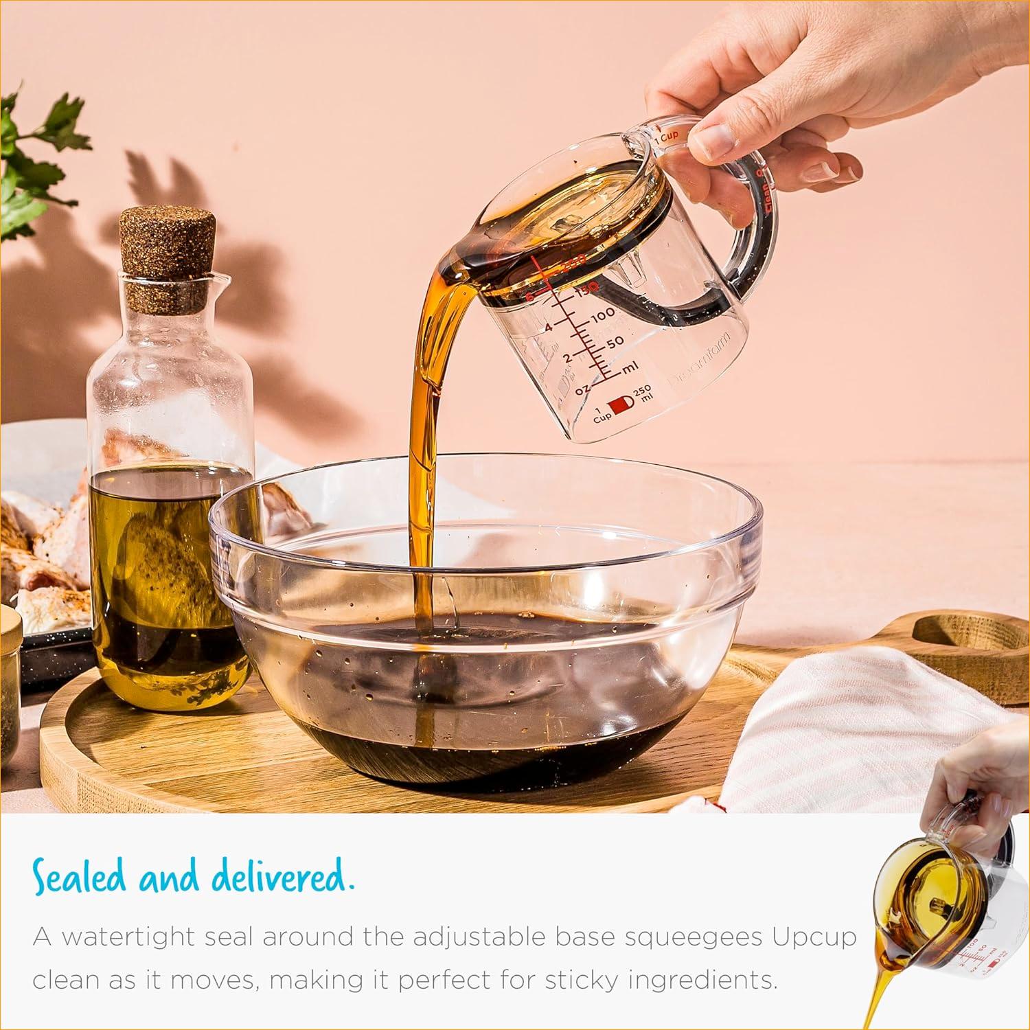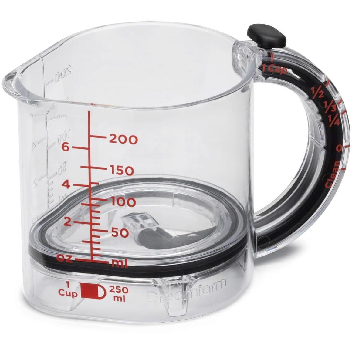 The Upcup from those clever folks at Dreamfarm in Australia is a 4-in-1 adjustable measuring cup that scrapes itself clean for wet, dry, and sticky ingredients. The Upcup has a 1-cup capacity, and if you want, locks to 6 preset volumes with a sliding switch in the handle: 1 cup, 1/2 cup, 1/3 cup, 1/4 cup, 0 for scraping, and the cleaning mode. A watertight seal around the adjustable base acts like a squeegee to clean the Upcup as it moves, making the Upcup the ideal choice for peanut butter, mayonnaise, honey, and other sticky ingredients. The adjustable base raises all the way to the top to scrape out every last drop, and can also be popped out for complete, easy cleaning in the dishwasher. The easy-to-read ml and fluid oz. measurements are printed in red and embossed in the BPA-free Tritan cup and will never rub off. You need to watch the video below to see how cool the Upcup really is.