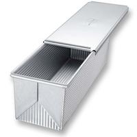 This pullman loaf pan lets you bake perfectly shaped sandwich bread for at-home use. Its square shape and cover combine to produce square sandwich bread shaped like those of commercial bakeries. Or, you can leave the cover off and get the rounded tops produced by open loaf pans. The pan is also great for quick breads that have a tendency to overflow the pan. It measures 9" x 4" x 4".