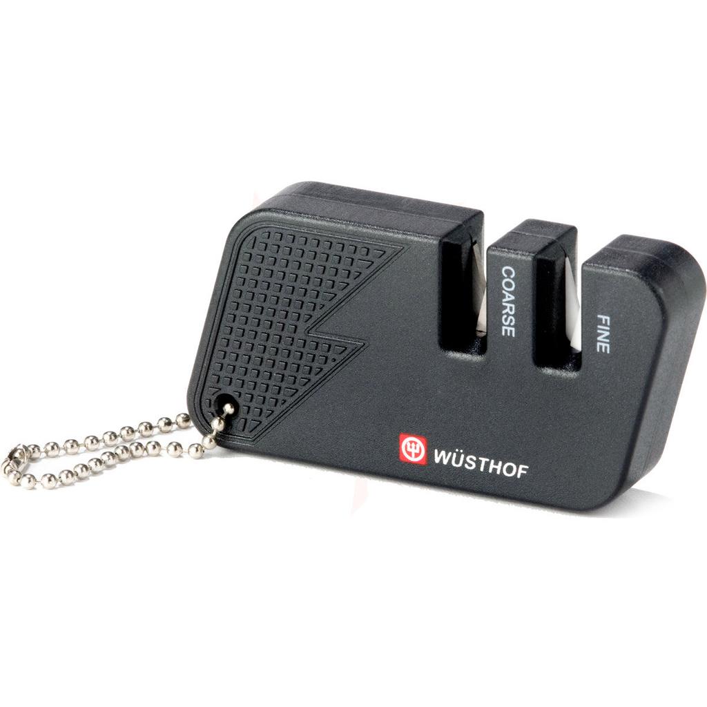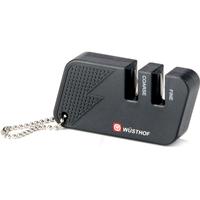 No, it's not a joke; this is a real, two-stage knife sharpener small enough to fit on a key chain. Measuring just 3" x 1", and weighing a mere 1 oz. this sharpener has two stages. One stage employs carbide rods that remove a small amount of steel to apply a new edge, the other stage features ceramic rods that realign the edge for regular maintenance between sharpening, or for fine honing. Rubber feet keep this little sharpener stable while in use.