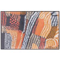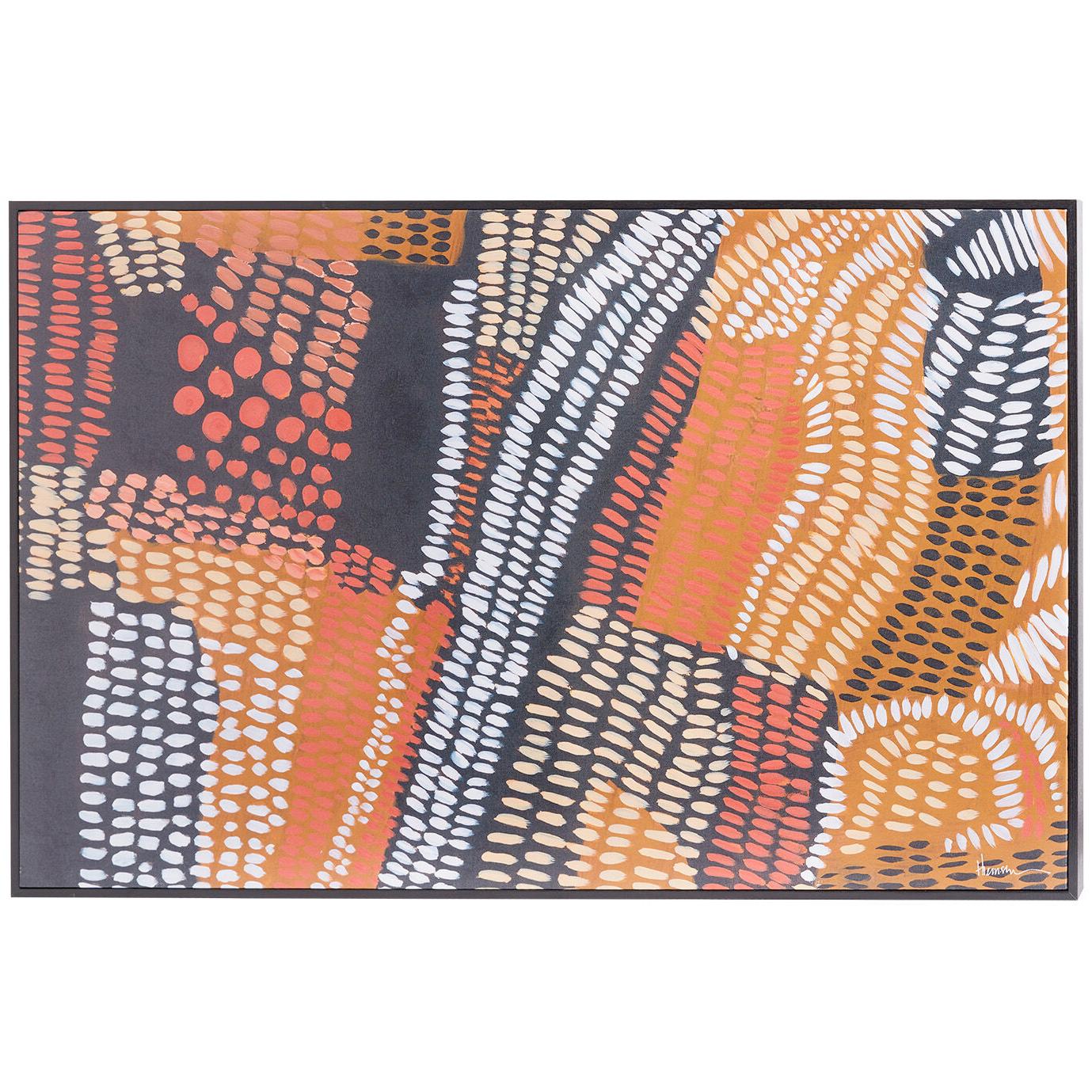 Boldly colored and patterned paper inside a wood frame measure in 40” x 26”.