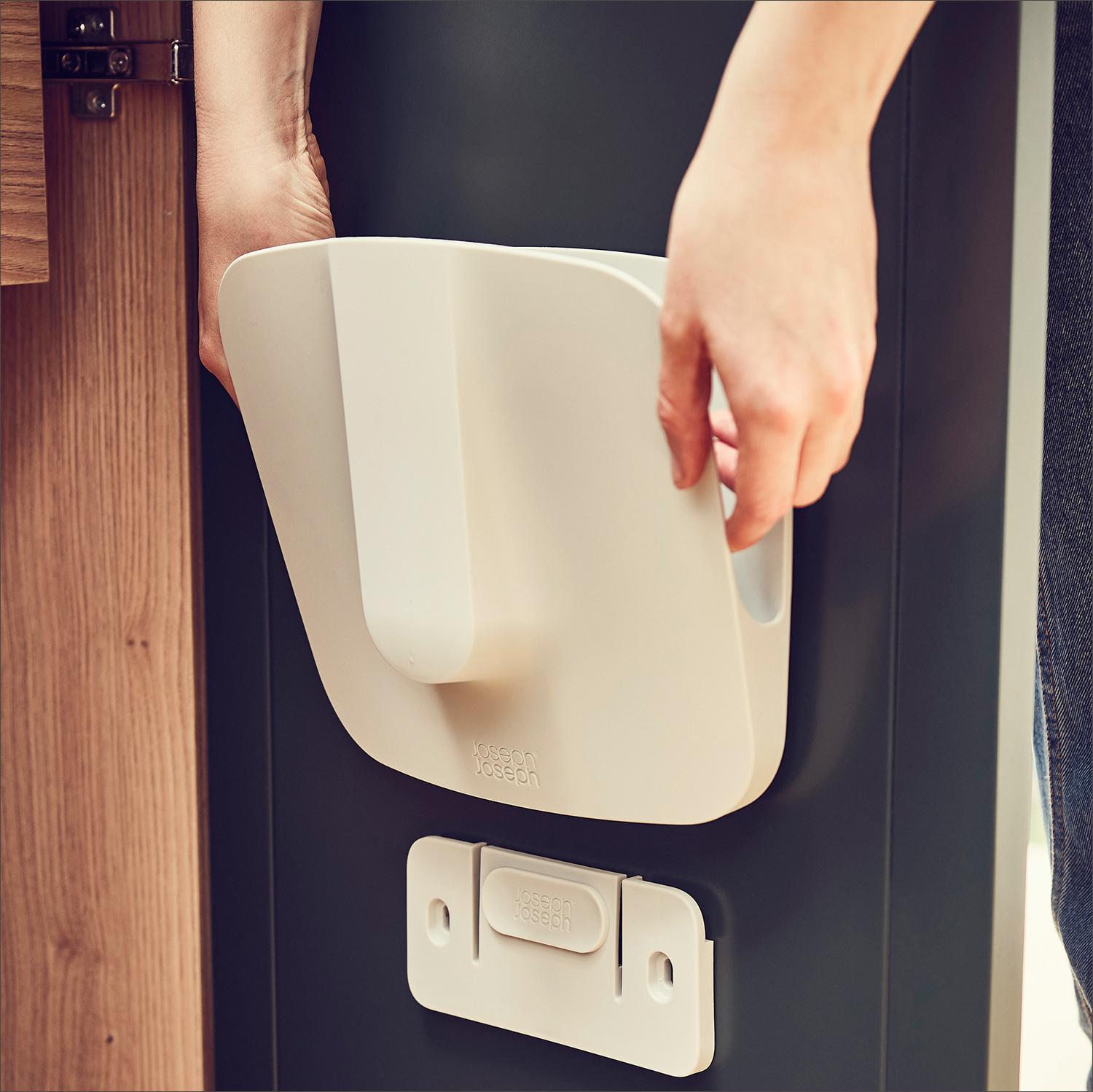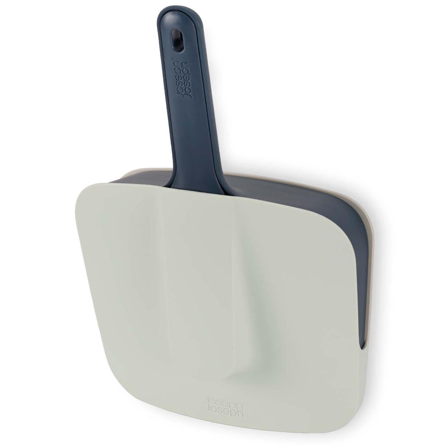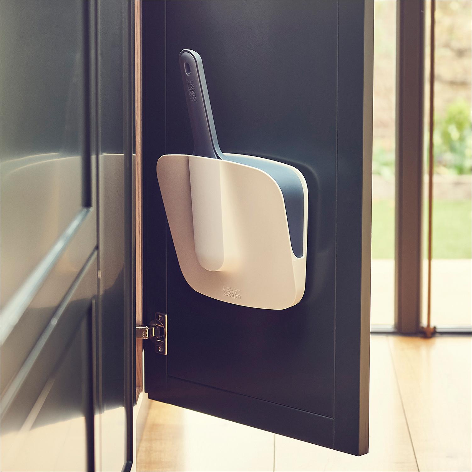 This clever set from Joeeph Joseph lets you keep a dustpan and brush handy on a closet wall or the back of a cabinet door. Use the included screws to attach the mounting bracket to a flat surface, then slide the holder over the bracket. The holder neatly stores the dustpan and brush, containing dirt and dust. The brush features soft, flexible bristles and the dustpan has a rubber edge to work well on uneven surfaces. When mounted, the complete set measures 8.7" wide, 4.6" deep and 13.3" tall through the dustpan handle.