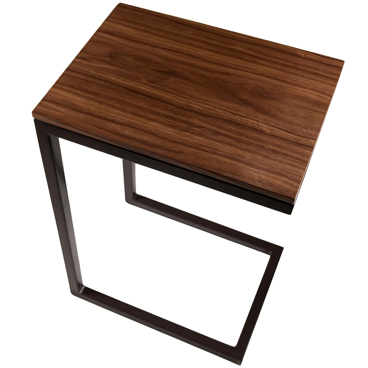 Designed to be your sofa companion, the minimalist Cee table slips its base under your sofa, slides the top just over the sofa cushions, and creates a stable surface for a drink, a coffee cup, or a laptop. Or, place it next to a chair or sofa for a stylish end table. It features a welded, powder-coated black steel frame and a walnut-veneer top. The Cee table measures 12" wide, 16" deep and 22.5" high.