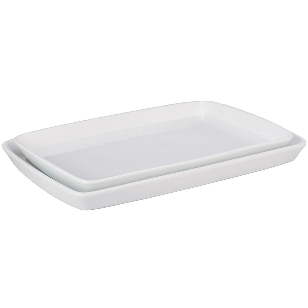 Porcelain is among the strongest and most durable ceramic materials, safe in the oven, microwave, freezer, and dishwasher. The large Lido platter (on the bottom in the picture) measures 18.75" x 12.25" x 1.5" high.