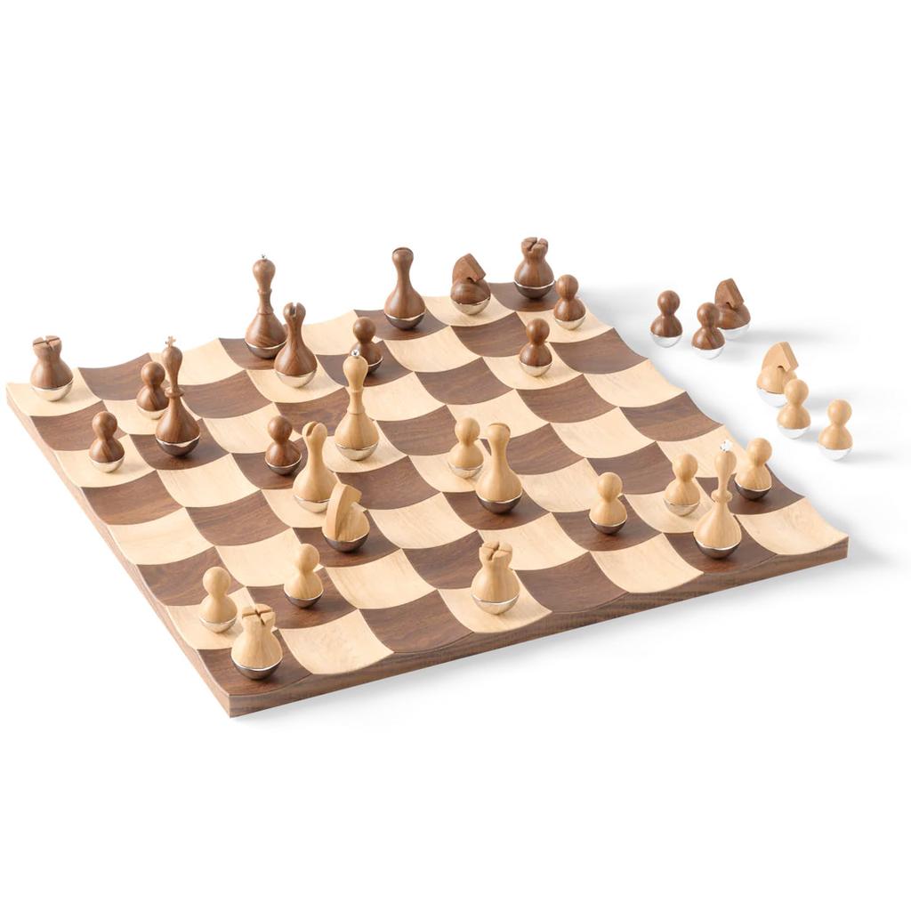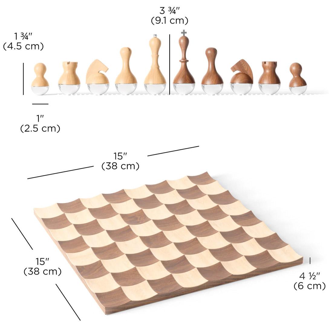 A chess set like no other, the design-award-winning Wobble Chess Set is the perfect combination of classic and modern. Made from beautifully polished walnut and maple, and featuring a concave landscape and freely quivering chess pieces, this set brings a whole new level of excitement to the game, and is the ultimate showpiece for your living room. Thanks to its concave landscape, the weighted playing pieces can freely tilt and quiver, but they stay in place when the board is moved. The maple and walnut base measures 15" x 15".