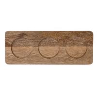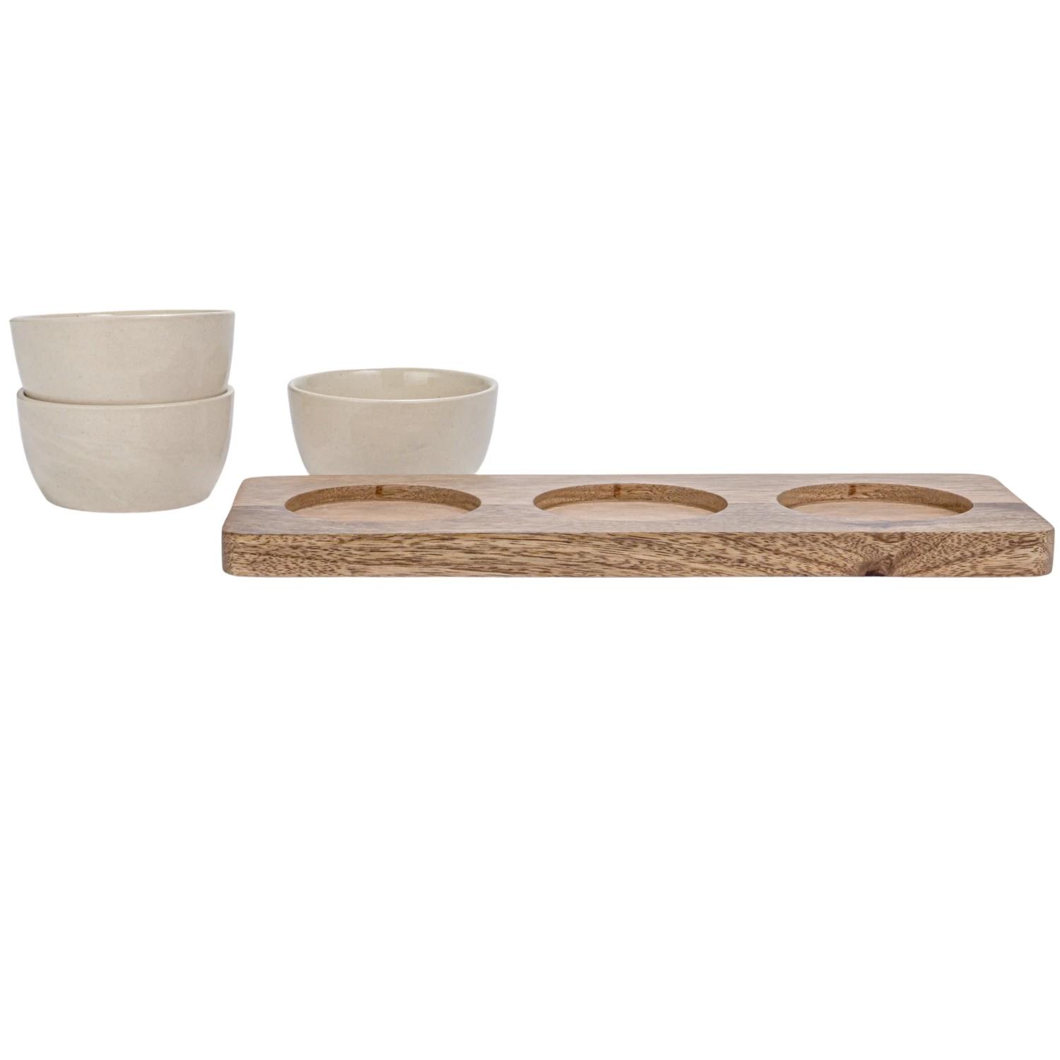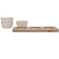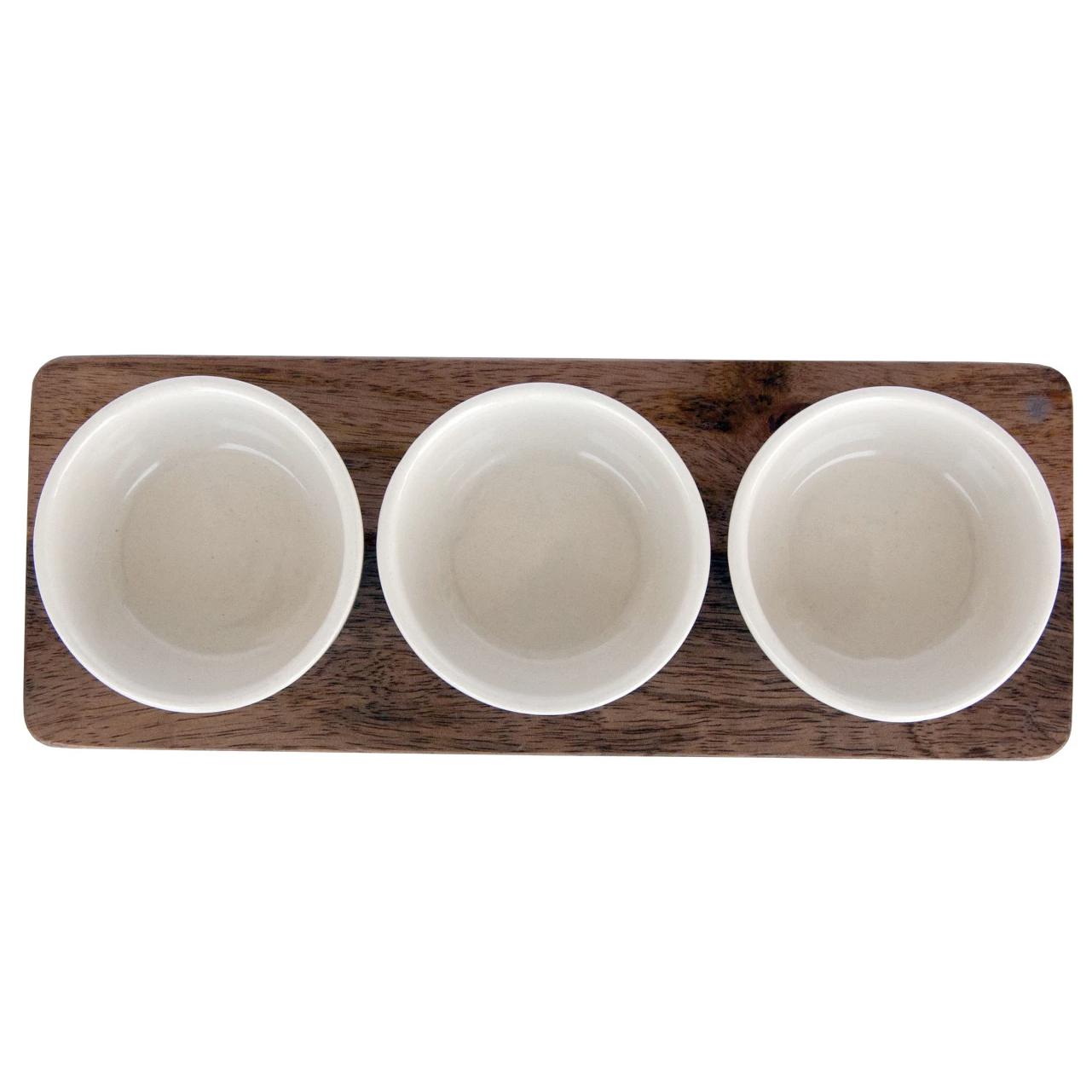 Perfect for putting out dips and sauces, this set features a solid mango wood tray and three stoneware bowls that are safe in the microwave and dishwasher. Each bowl has a 2-oz. capacity and measures 3.25" in diameter and 1.5" high. The mango wood tray measures 10.5" x 4".