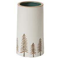 Featuring a dark-green, hand-glazed interior and a white outer glaze with hand-etched trees, this charming ceramic vase measures 4.5” in diameter and 8” tall.