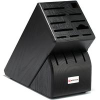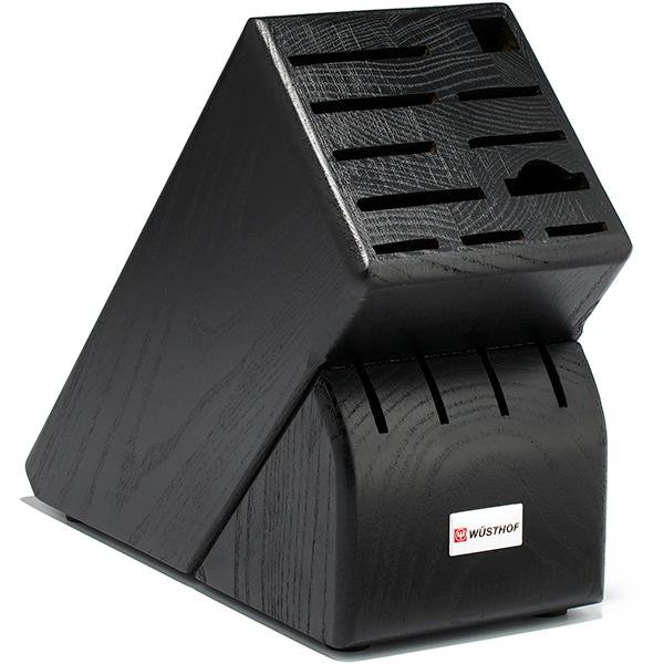 This hardwood block can store up to 15 knives, including a honing steel and a pair of kitchen shears, four steak knives or paring knives, and two large chef's knives or santokus. Non-slip feet keep it place on your counter. It measures 5" wide, 11" deep and 9" high.
