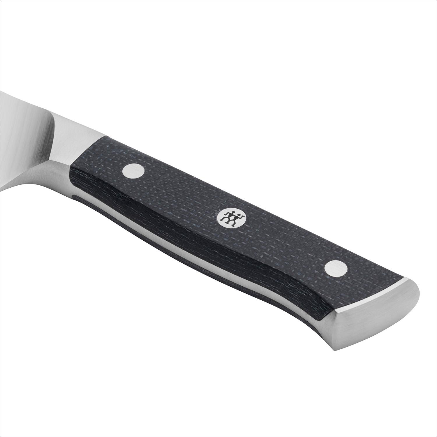Spectrum knifes are Zwilling’s sharpest, most advanced cutlery yet. Forged from a single piece of special-formula, high-carbon stainless steel, Spectrum knives feature a precision-honed, 25° edge, a smaller angle that enhances sharpness and precision cutting. Each knife features a curved, demi-bolster that allows for a comfortable pinch grip, and lets you hone and sharpen the full length of the blade. Spectrum handles are made from jute Micarta, layers of fabric that are impregnated with resin and cured, creating a distinctive lattice appearance and providing a comfortable, secure grip. A distinctive stainless-steel end cap adds to the sophisticated look. Spectrum knives are made in Germany using a process that reduces by half the CO2 emissions from steel-making.